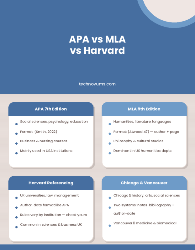 Harvard referencing is widely used across UK universities and is common in business, law, management, and scientific fields. It uses an author-date format similar to APA but with slightly different punctuation rules. Unlike APA and MLA, Harvard is not owned by a single organisation, so conventions can vary slightly between institutions. Always check your university’s specific Harvard guide.