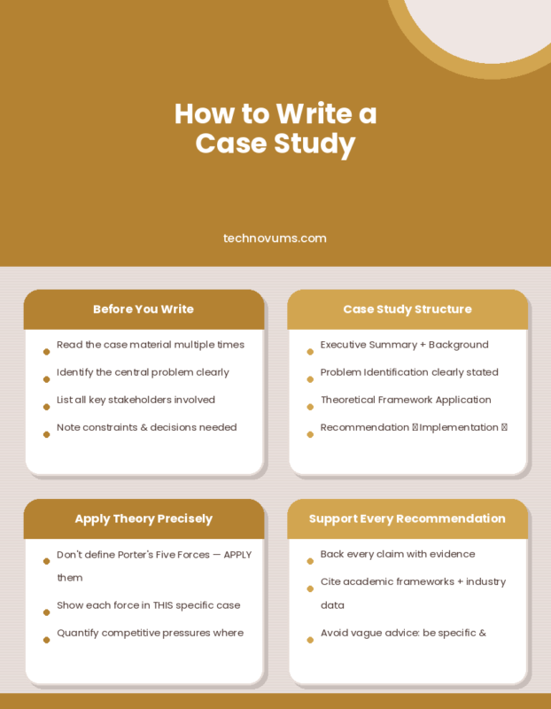 Before typing a single word, read the case material multiple times. Identify the central problem or issue. Who are the key stakeholders? What decisions need to be made? What constraints exist? Annotate the case material and create a summary of the most important facts. Students who rush this stage often write case studies that answer the wrong question.