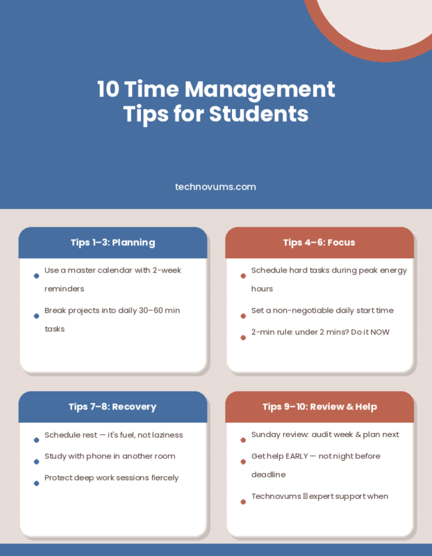 Between lectures, part-time jobs, social commitments, and a stack of deadlines, managing time effectively is one of the greatest challenges of student life. Poor time management does not just cost marks — it fuels stress, burnout, and poor mental health. These ten evidence-based strategies will help you reclaim your schedule and produce better work with less stress.